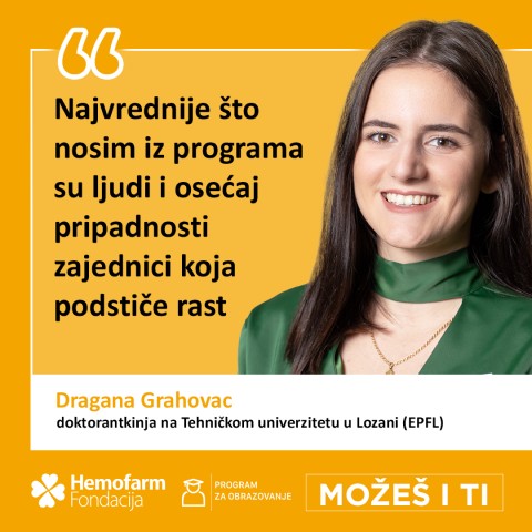 Upravo iz te zajednice potekle su mnoge priče o uspehu - jedna od njih je priča Dragane Grahovac, bivše stipendistkinje Hemofarm fondacije, danas doktorantkinje na prestižnom Tehničkom univerzitetu u Lozani (EPFL). Dragana je nedavno diplomirala na Kembridžu u oblasti mikro i nanotehnologije, a njen put od Petnice i WWF Adria, do praksi u Michelinu, Swisslionu, Petrohemiji i AmCham-u pokazuje koliko daleko mogu da odvedu radoznalost i hrabrost da se iskorači iz poznatog.